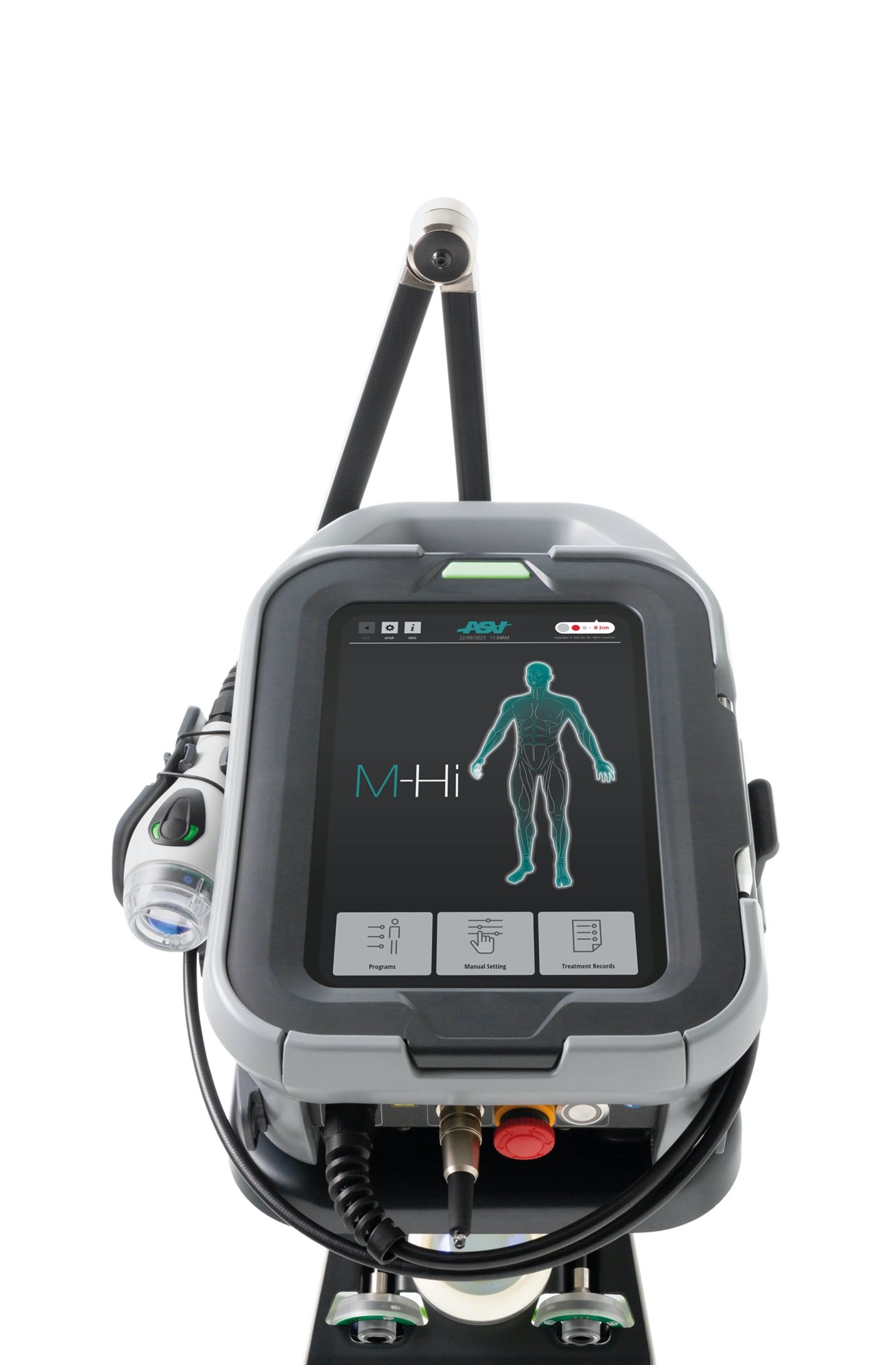 Mentre il carrello consente rapidi spostamenti all'interno della clinica, il braccio porta manipolo assicura un posizionamento preciso su diversi target corporei di tutti i pazienti per un utilizzo a punto fisso.